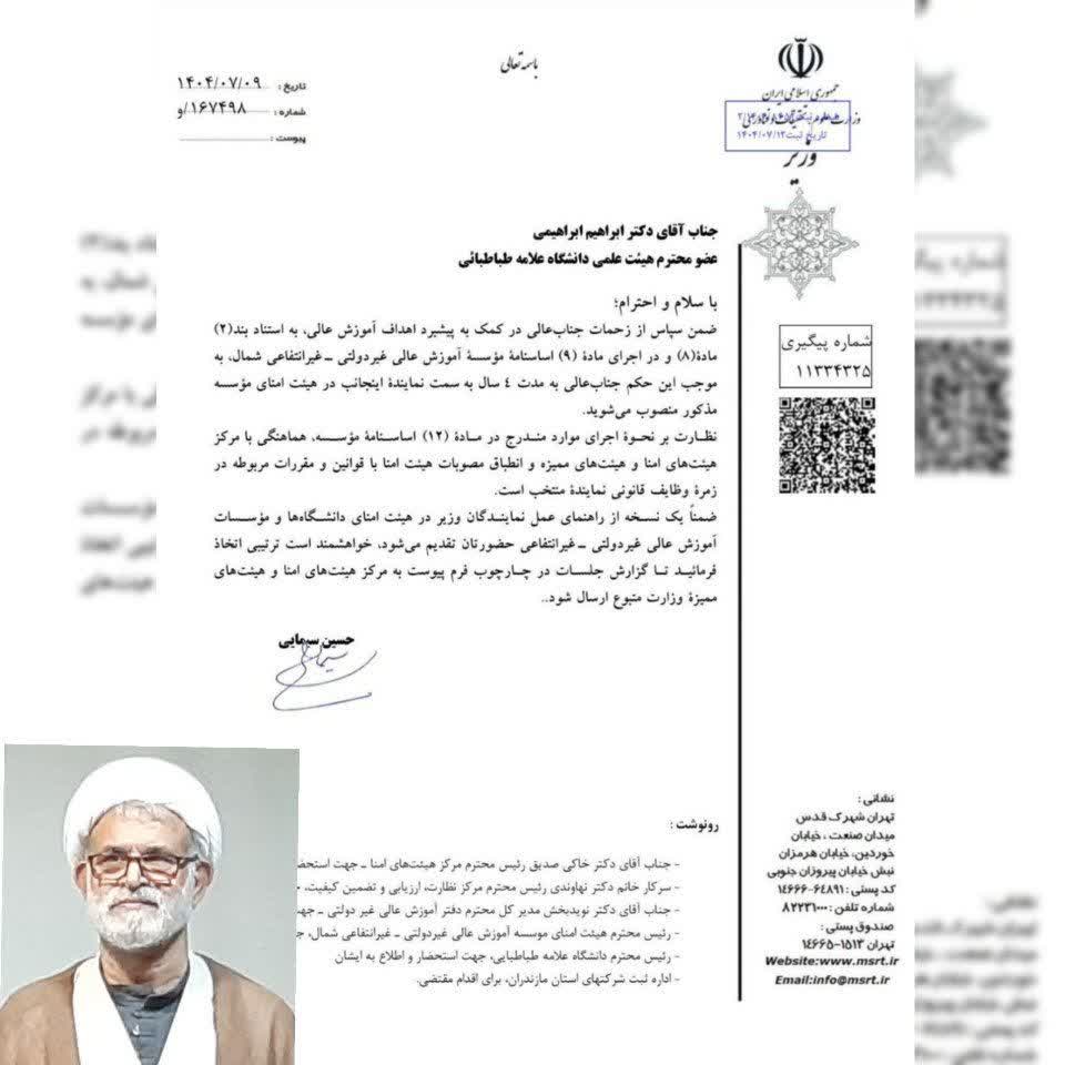 🔹 در متن حکم، ضمن قدردانی از خدمات علمی و اجرایی دکتر ابراهیمی در پیشبرد اهداف آموزش عالی کشور، بر ایفای نقش مؤثر ایشان در نظارت عالیه بر عملکرد هیأت امنا و همکاری با مرکز نظارت، ارزیابی و تضمین کیفیت آموزش عالی تأکید شده است.