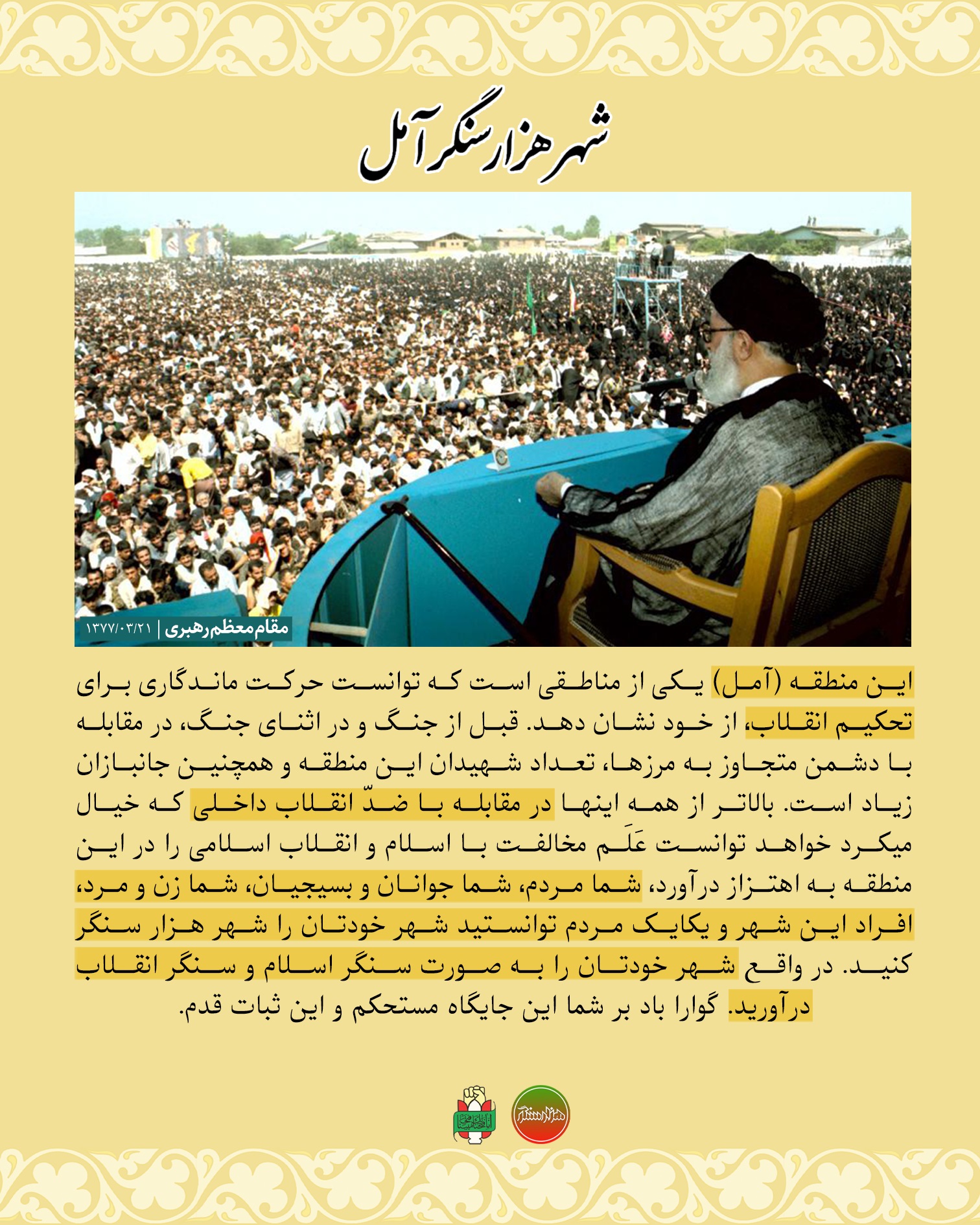 شهر شما هم در گذشته و هم در دوران انقلاب، شهر درخشانی بوده است؛ تاریخ درخشانی پشت سر این مردم مؤمن و خونگرم است. مردم شهر آمل در گذشته – در دورانی که شمشیر مبارزان در سرتاسر دنیای آن روز پیش میرفت – در مقابل شمشیرها تسلیم نشدند؛ اما پیام حقّ و حقیقت را از خاندان پیامبر، با عاطفه و محبّت و عشقی که به آن خاندان داشتند، دریافت کردند.